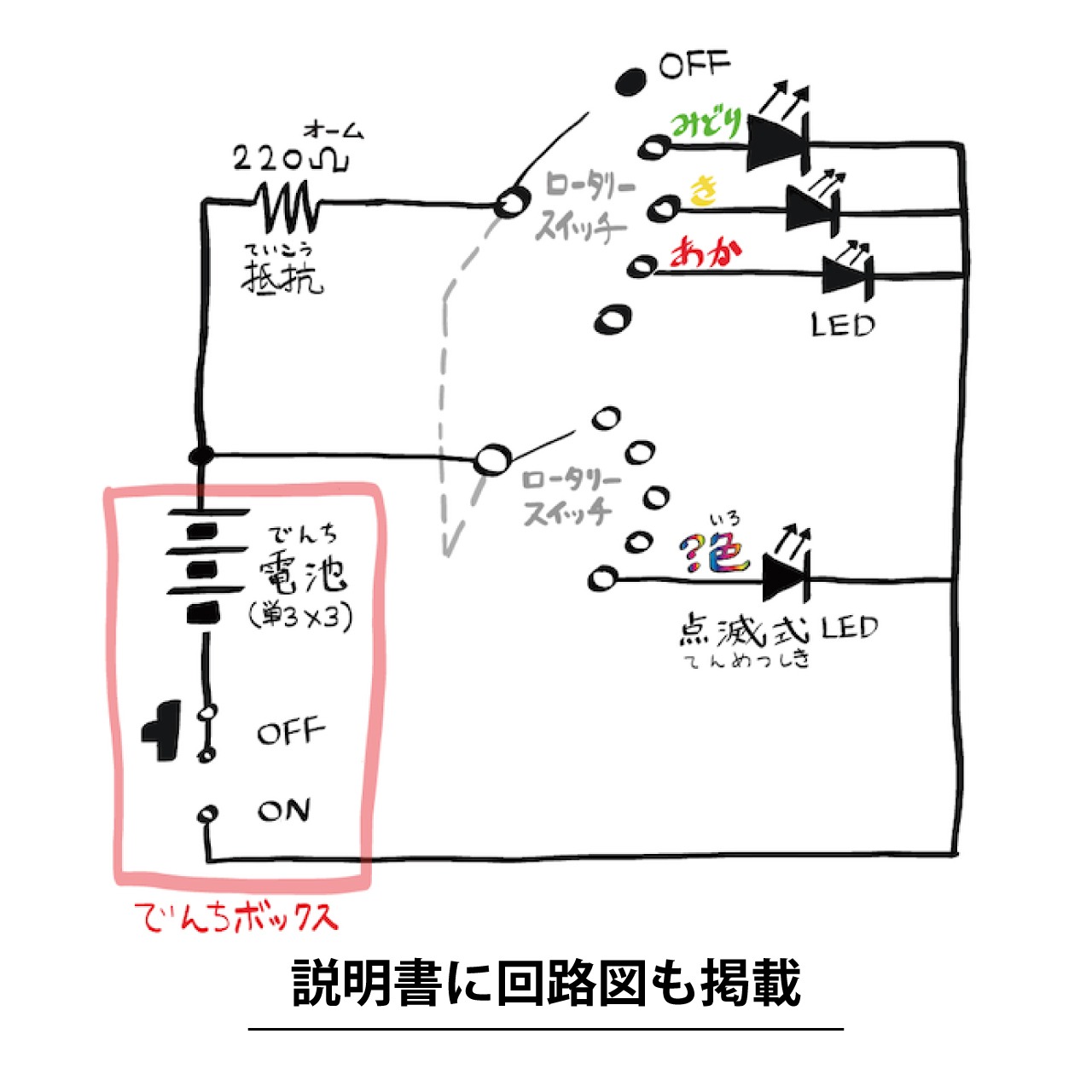カチカチとスイッチを回すと、LEDの色が変わっていく、楽しい電子工作キットです。